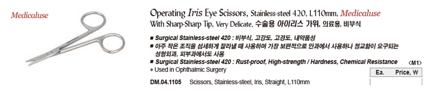 품명 수술용 아이리스 가위, 의료용, 비부식 Operating Iris Eye Scissors