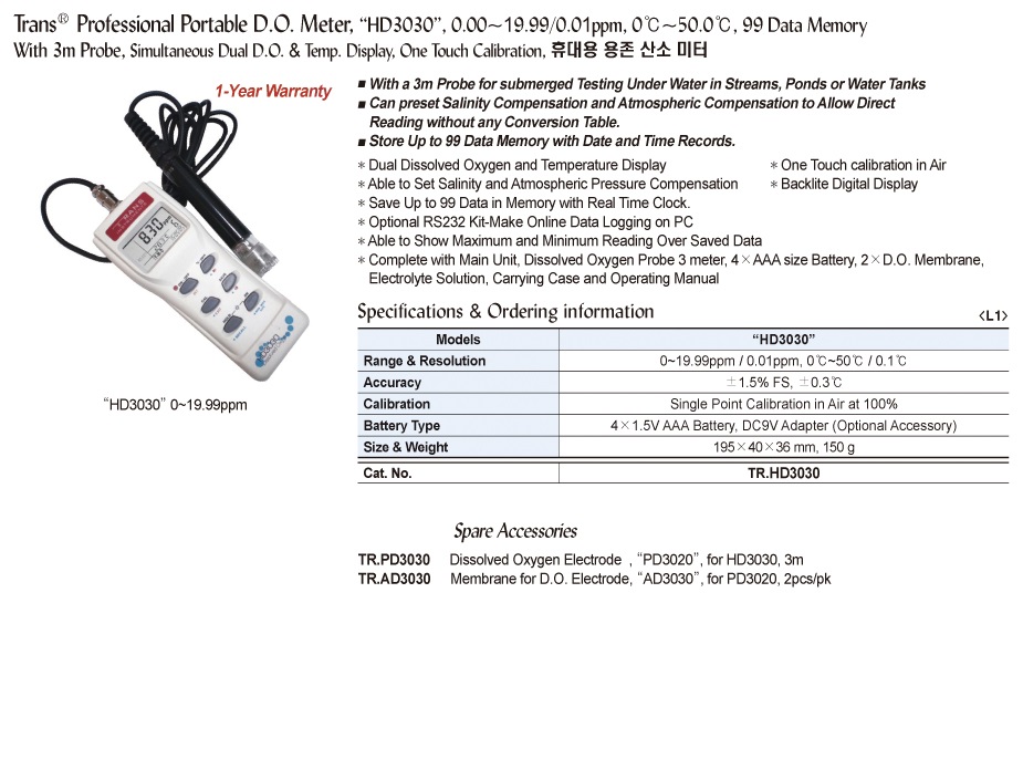 Trans® Professional Portable D.O. Meter, “HD3030”, 0.00~19.99/0.01ppm, 0℃~50.0℃, 99 Data MemoryWith 3m Probe, Simultaneous Dual D.O. & Temp. Display, One Touch Calibration