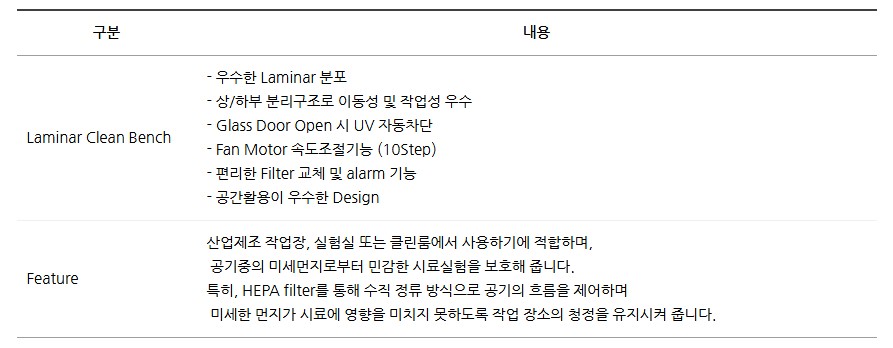 크린벤치(Laminar Clean Bench)는 산업 제조 작업장, 실험실 또는 클린룸에서 사용하기에 적합한 장비로,