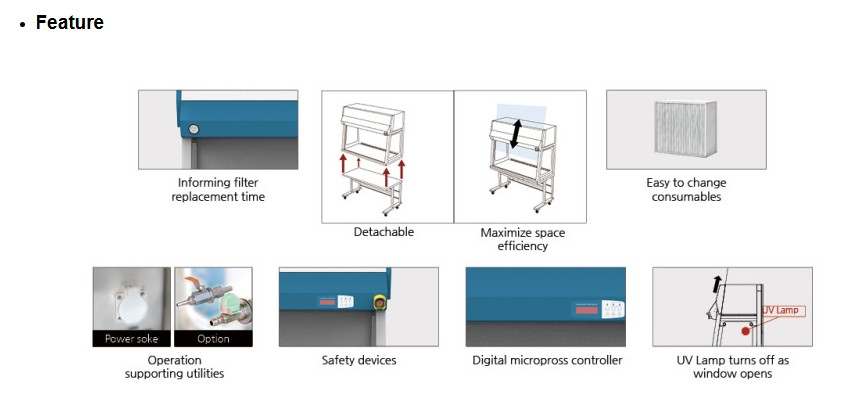 청정한 작업 환경을 유지시켜 줍니다. Glass Door 자동 차단 기능, Fan Motor 10단계 속도 조절,
