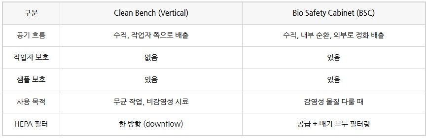 ?클린벤치(Clean Bench) vs 생물안전작업대(Bio Safety Cabinet, BSC)