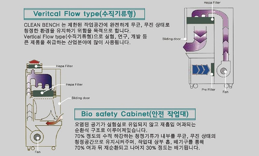 품명 HEPA 필터 장착 무균작업대! 슬라이딩 도어, UV램프, Hour Meter 포함 수직기류형 Clean Bench 시리즈