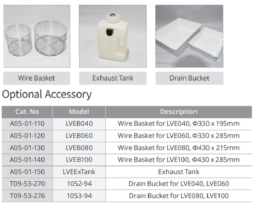 - 각 모델에 맞는 Wire Basket 2개 및 Exhaust Tank(배기용 탱크) 기본 포함