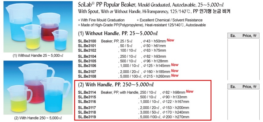 SciLab® PP Popular Beaker, Mould Graduated, Autoclavable, 25~5,000㎖With Spout, With or Without Handle, Hi-Transparency, 125/140℃, PP 인기형 눈금 비커