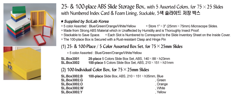 25- & 100-place ABS Slide Storage Box, with 5 Assorted Colors, for 75×25 Slides with Numbered Index Card & Foam Lining, Stackable