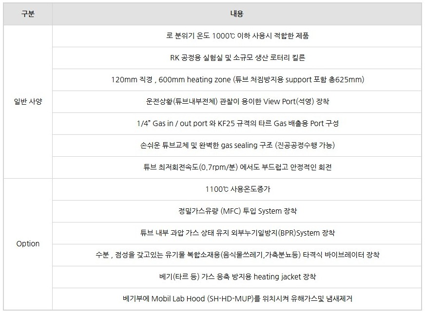 품명 1200도 2존 회전식 로터리 킬른 SH-FU-120RKG600, 정밀 온도제어 및 다양한 가스 포트 구성으로 실험실에 최적화된 장비입니다.