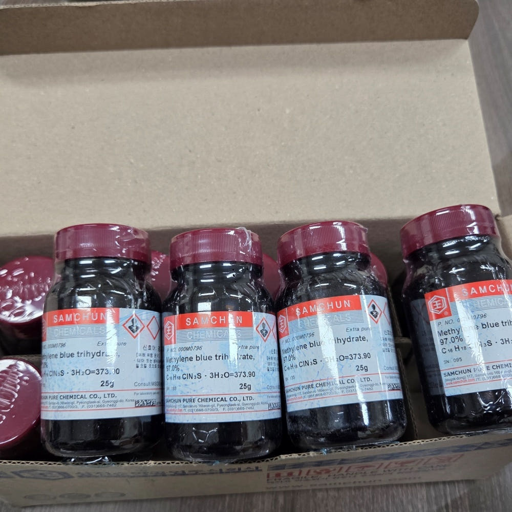 품명 메틸렌블루 97% EP 25g 분말 시약. 실험실·연구소 연구용 고순도 시약으로 다양한 분석 및 실험에 활용 가능.