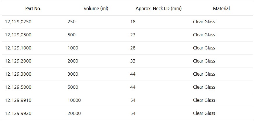 품명 배양 배지 및 용액 보관용 투명 세구 용액병. 내화학성 투명유리 재질, 매트 마감 메모영역 포함. 250~20000ml 다양한 용량으로 실험실용에 적합.