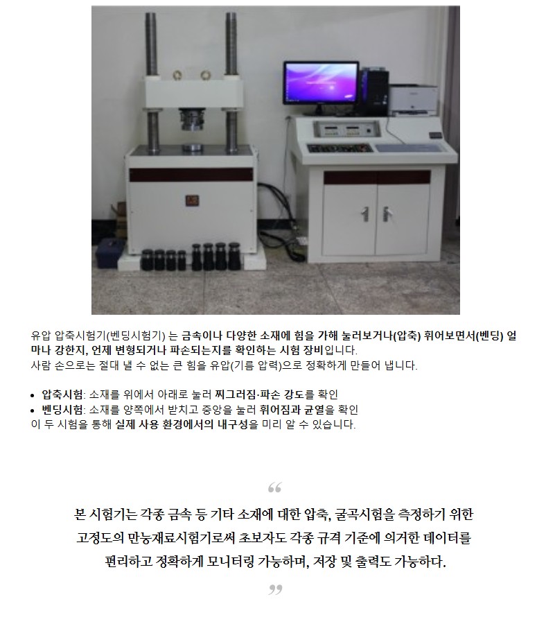 품명 금속 및 소재의 압축·굽힘 시험을 위한 유압식 재료시험기. 정밀한 하중 제어와 데이터 저장·출력 기능으로 시험실과 산업 현장에 적합합니다.