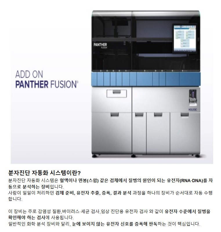 품명 검PANTHER Fusion은 TMA·Real-Time PCR을 하나의 플랫폼에서 수행하는 전자동 분자진단 시스템으로, 대용량 검체를 빠르고 정확하게 분석합니다.