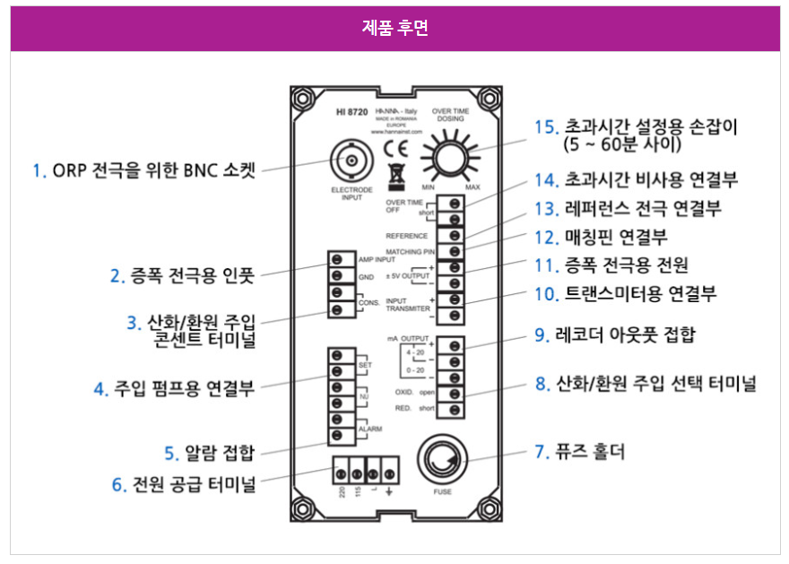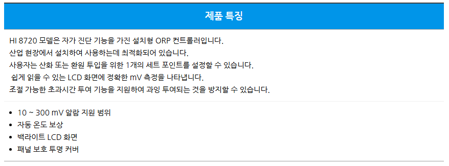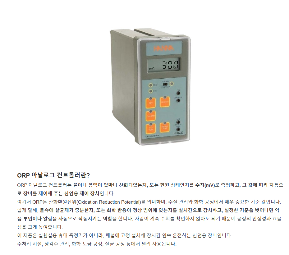 HI 8720은 액체의 산화·환원 상태(ORP) 를 전기 신호(mV)로 측정하고 제어하는 설치형 아날로그 컨트롤러입니다.