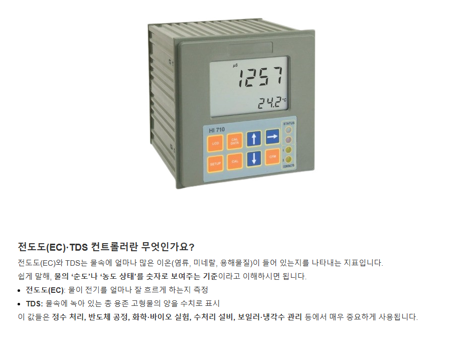 품명 HI710 전도도·TDS 디지털 컨트롤러는 자동 온도 보상과 PID 제어를 지원하는 산업용 EC/TDS 제어기로 공정 관리에 최적화된 장비입니다.