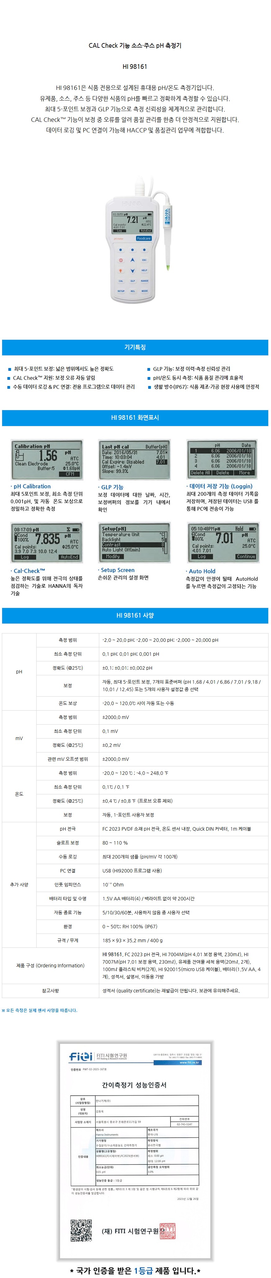품명 CAL Check 기능 소스·주스 pH 측정기 HI 98161